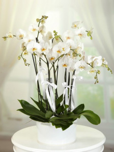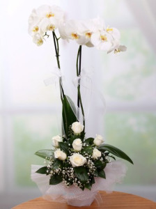 Çift Dallı Beyaz Orkide Kırmızı Gül : 7 Adet Yaklaşık Ürün Boyutu : 65 cm Kullanılan Diğer Ürünler : Seramik ve Cipsofilya Sevginizin masumiyetini orkide, canlılığını kırmızı güller ile ona anlatmanın tam sırası.