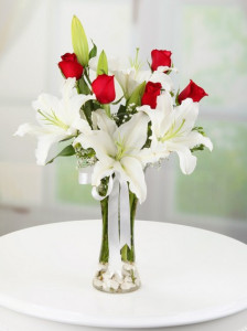 Kadife kalp kutu içerisinde kırmızı ve beyaz güllerden oluşan harf arajman